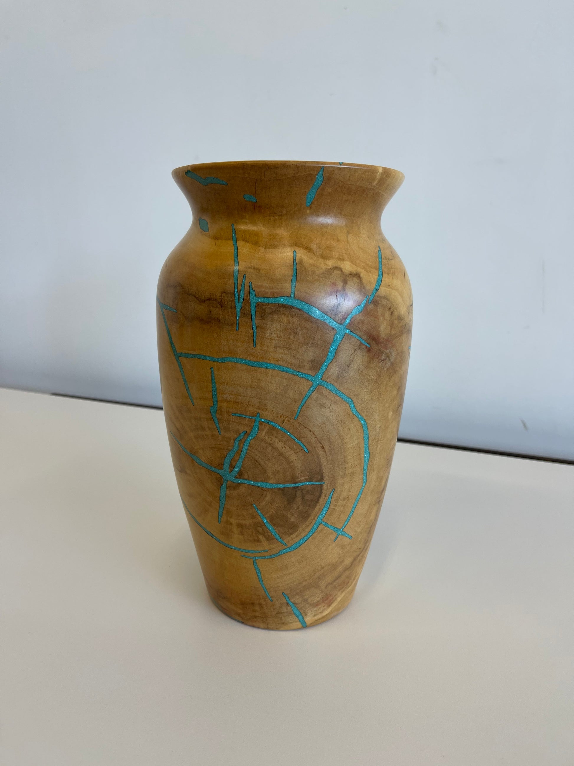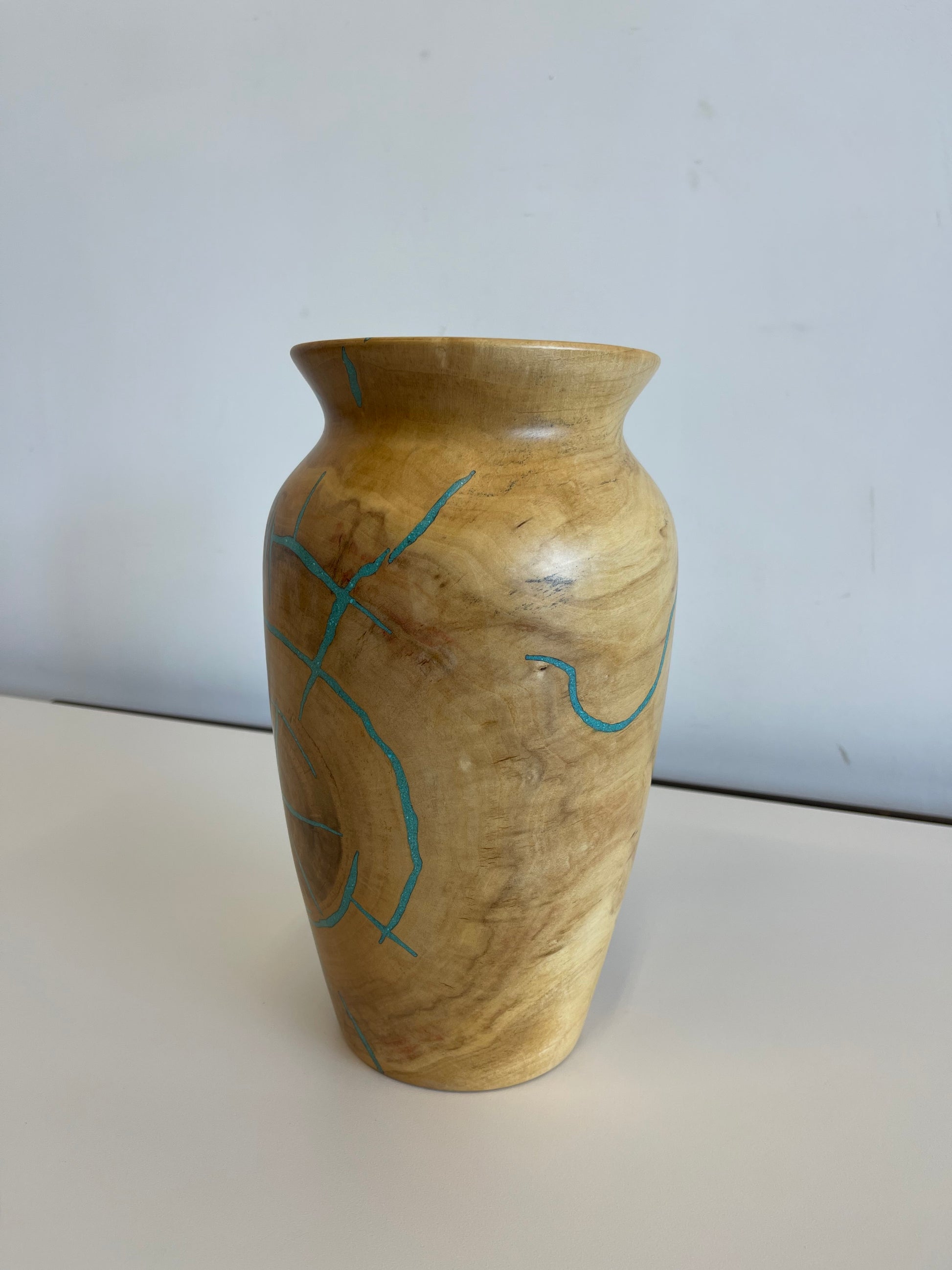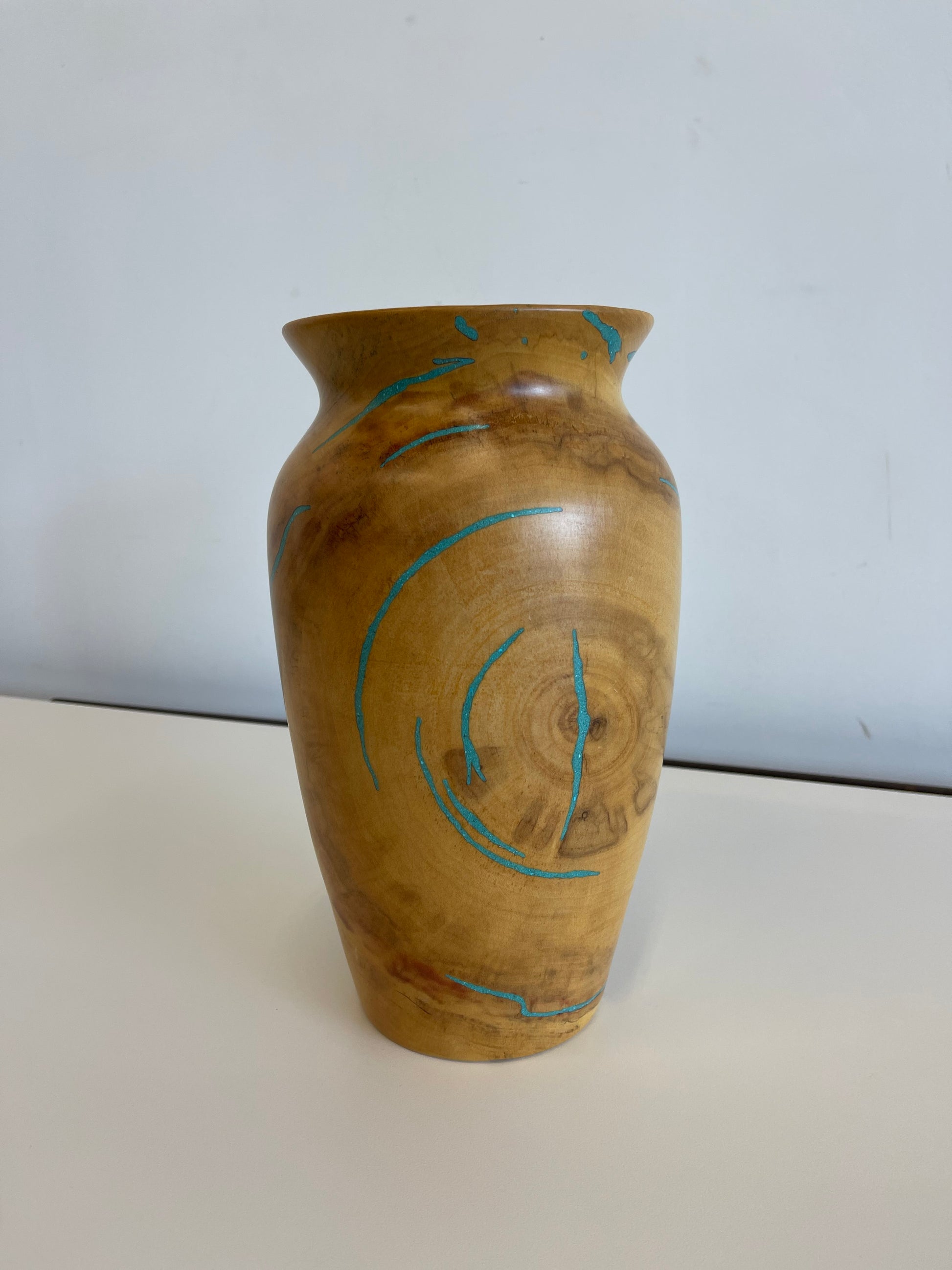 This elegant Boxelder wood-turned vase with turquoise inlay was handcrafted by studio artist and woodworker Chris Zema. It features a unique design that is sure to add a touch of sophistication to any room. The subtle turquoise inlay is the perfect accent to the natural wood grain, creating a beautiful balance of texture and color.