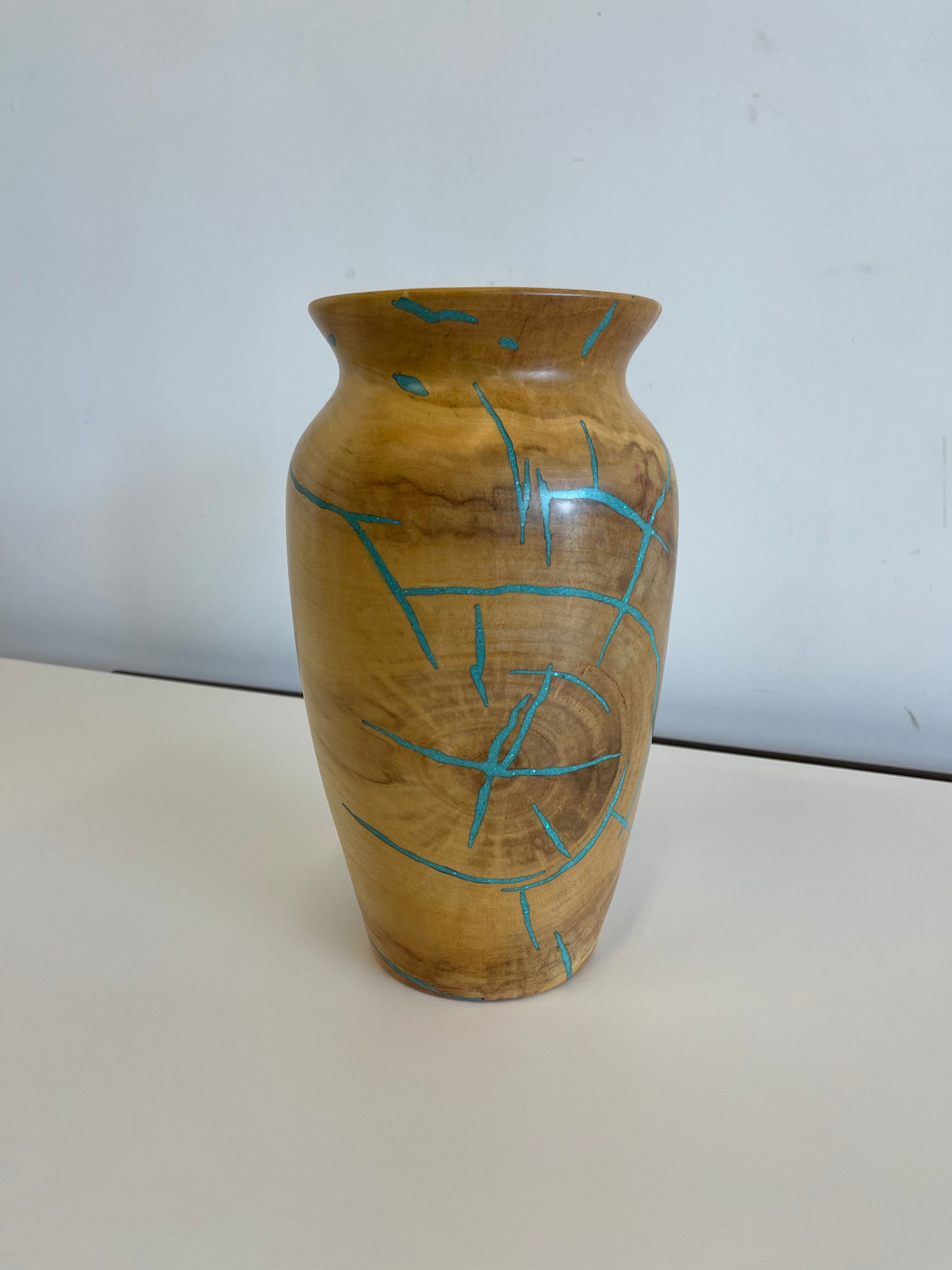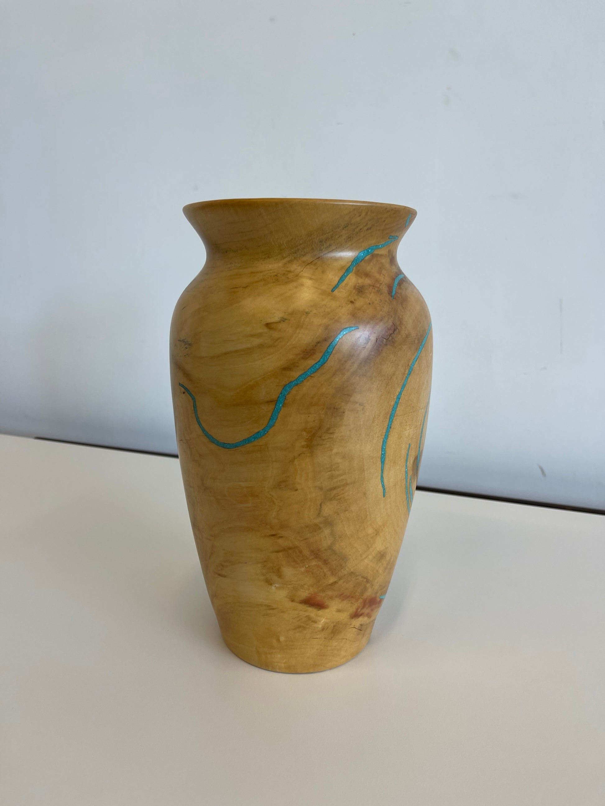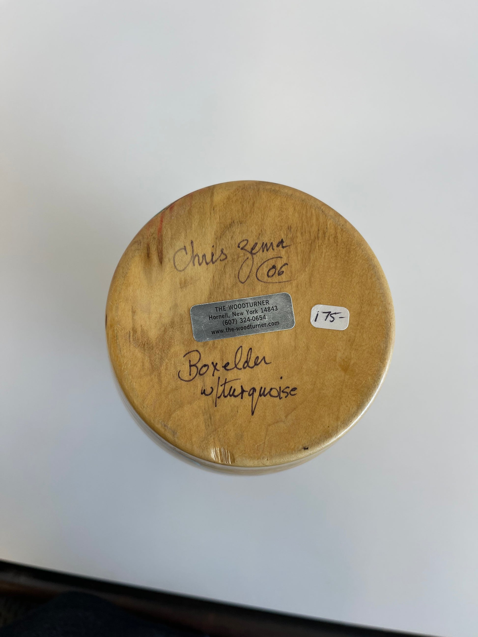 This elegant Boxelder wood-turned vase with turquoise inlay was handcrafted by studio artist and woodworker Chris Zema. It features a unique design that is sure to add a touch of sophistication to any room. The subtle turquoise inlay is the perfect accent to the natural wood grain, creating a beautiful balance of texture and color.